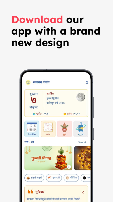 Quickly access Day, Date, Tithi and feature of the day on the dashboard with detailed information on Yog, Nakshatra, Karan etc.